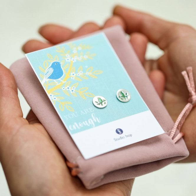 Turquoise birds on branches are made from enamel on a sterling silver base, a lovely pair of earrings for everyday wear with a simple stud finish.