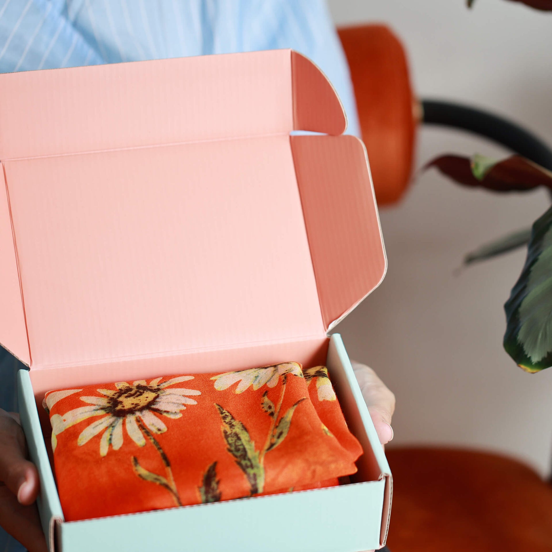 To make your purchase even more special, we offer the option to include a beautifully designed gift box, ensuring your scarf arrives in perfect condition and ready for gifting. You can also add a personalised gift card to convey your warmest wishes to a loved one or friend, making this Orange Sunflower Motif Scarf an ideal present for any occasion.
