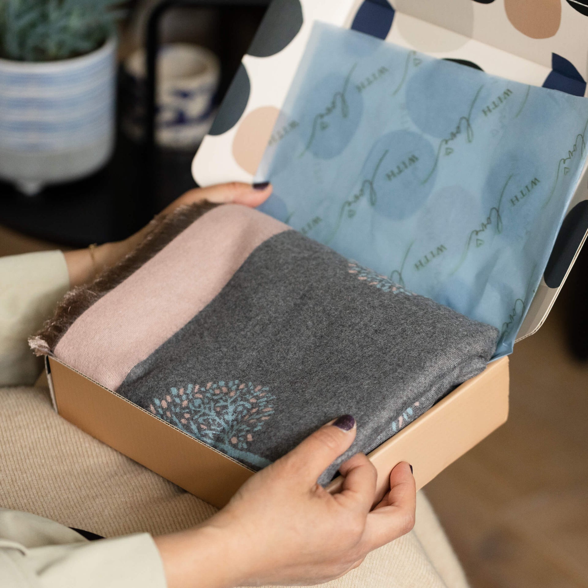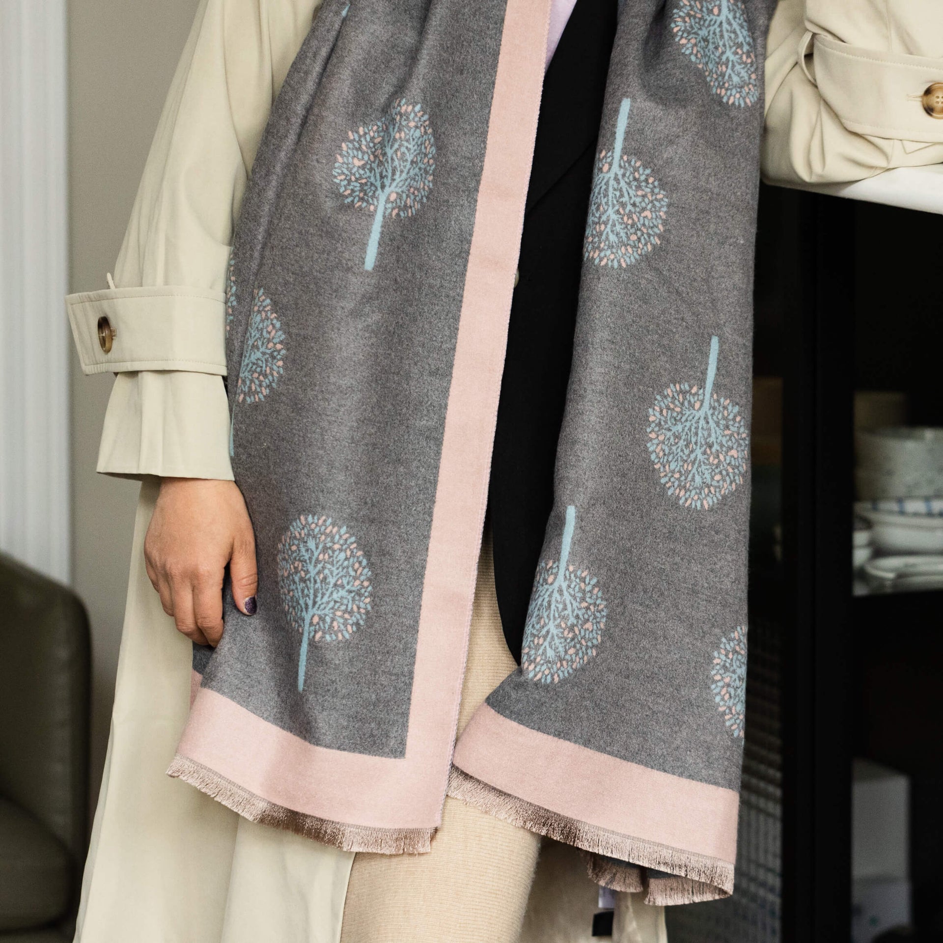 Our beautiful cashmere blend Tree of Life Motif scarf, decorated with our special tree motif in lovely light pink and blue hues.