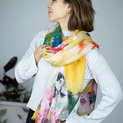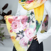 Bright and vibrant roses are printed onto a yellow background, making a beautifully colourful piece to add some style and interest to any outfit.