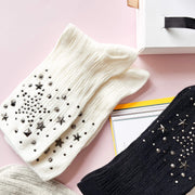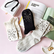 Available in classic black, crisp white, or chic grey, these socks are designed to add a dash of sparkle to your everyday look. Each pair is adorned with shimmering star-shaped gems that catch the light and make you feel like you're walking among the stars.