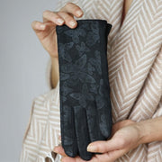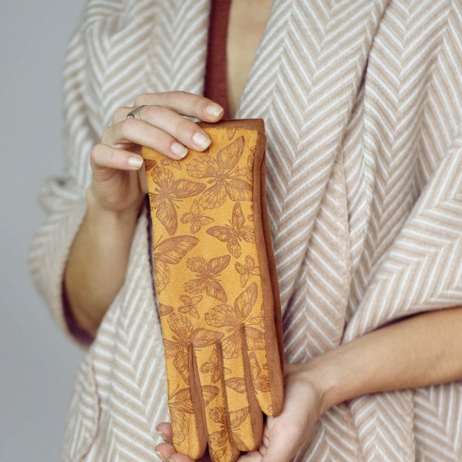 Soft stretchy suede fabric and elegant brocade style butterfly combine to make a versatile and luxurious pair of gloves, in a variety of colours that can suit any outfit.