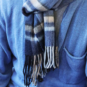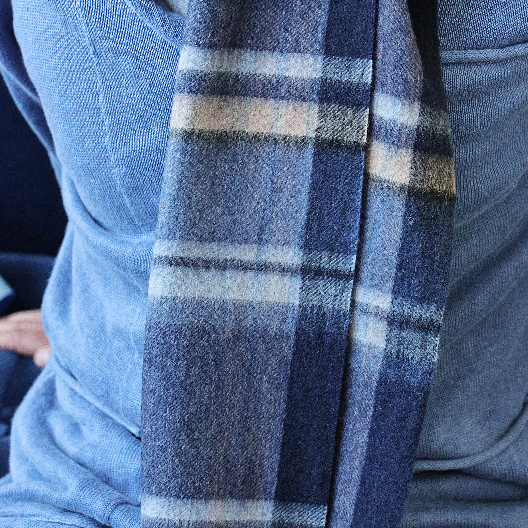 Wrap up in style with our Men's Blue Check Wool and Cashmere Blend Scarf. This luxurious accessory, crafted from a high-quality blend of 85% wool and 15% cashmere, offers unmatched softness and warmth. The timeless blue check pattern is a versatile addition to any wardrobe, effortlessly complementing both casual and formal outfits.