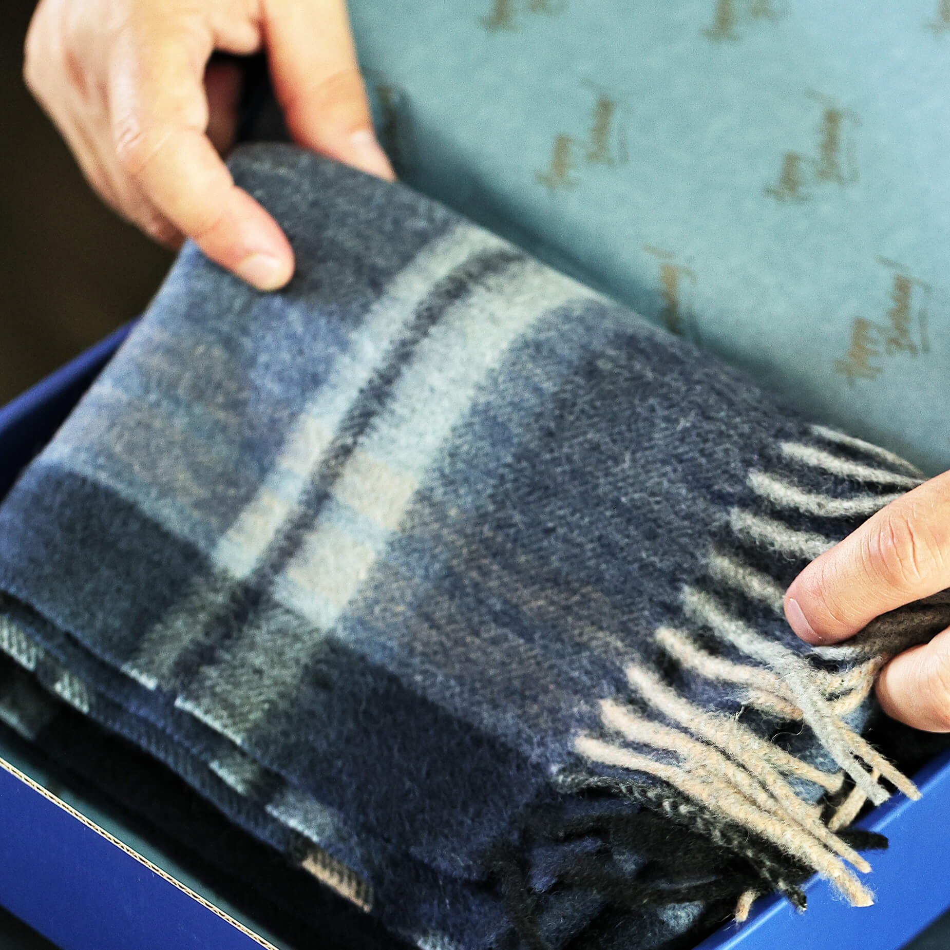 And to make your gift even more memorable, opt for our chic gift box, complete with themed tissue paper. It's not just a scarf; it's a statement of style and affection. Give the gift of warmth and sophistication with our Blue Check Wool and Cashmere Blend Scarf.